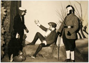 The Drama Group presented its first Christmas production, “Toad of Toad Hall” by A.A. Milne, produced and directed by Harold Ingram, formerly musical director of the Stratford-on-Avon Theatre, with beautiful sets by his daughter Pamela Ingram, Scenic Designer at the Yvonne Arnaud Theatre in Guildford. She also ran scenery workshops creating stage trees and river banks: “At an extremely late rehearsal on New Year’s Eve, Harold Keeping, who was playing Badger, fell backwards putting an end to rehearsals and possibly our New Year festivities. Fortunately Badger was wearing a thick jacket and belt so suffered no more than stiffness and bruising! The show was so successful we had to put on an extra performance on the second Saturday.” More than fifty Christmas shows and pantomimes have taken place since.